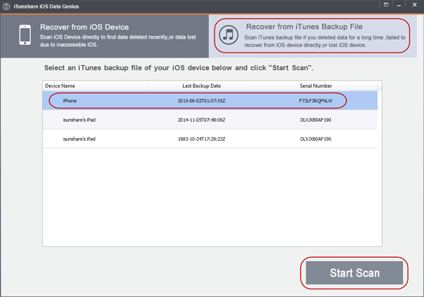 但是,如果您无法确定是否有 iPod iTunes 备份,请选择从 iOS 设备恢复运行iOS Data Genius后,扫描iOS设备。然后按照与“从 iTunes 备份文件恢复”相同的操作进行操作。