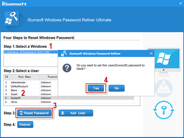 当锁定的计算机从可启动密码重置盘启动后,Windows 密码修复器程序将显示在屏幕上。在屏幕上选择您的 Windows 系统和您忘记密码的用户帐户。然后点击重置密码按钮将其解锁。您的密码将被删除,然后您无需密码即可进入您的计算机。