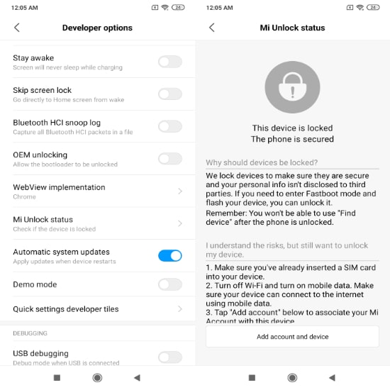 在此步骤中,您必须将您的帐户与小米解锁授权选项卡绑定,您可以在开发者设置下找到该选项卡。