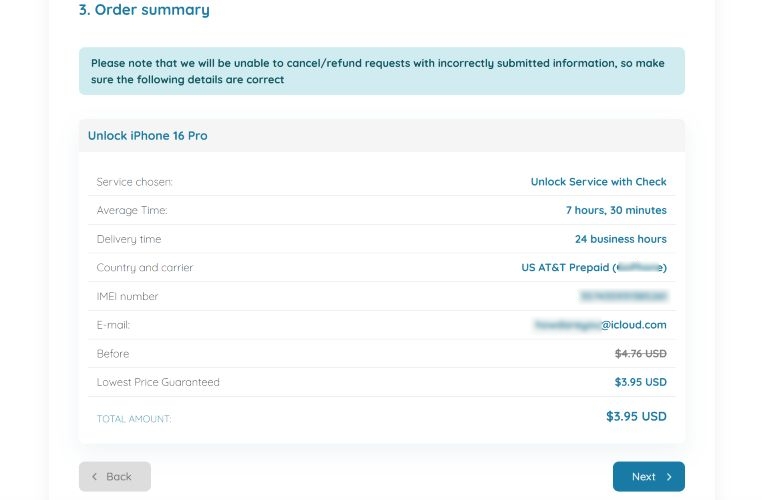 步骤 4。提供您的 iPhone 的 IMEI 号码、您的电子邮件并同意条款。然后,单击下一个。