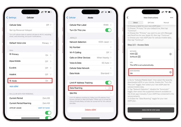 步骤3:选择您的 eSIM 并启用打开这条线。然后,打开或关闭数据漫游根据 Airalo 应用程序中的 eSIM 指南。