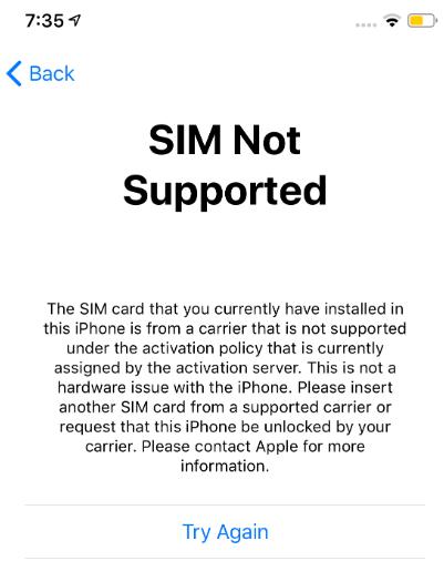 或者,您可以插入其他公司的SIM卡来测试您的iPhone是否被SIM卡锁定。如果您看到 SIM 不受支持,则表示您的设备上存在运营商锁定。