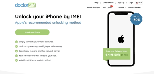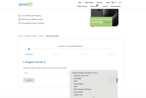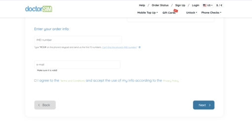 解锁 iPhone 运营商的另一种方法是使用在线付费服务。您可以使用 doctorSIM 来解锁,利用 IMEI 号码。在这里,您必须提交设备的 IMEI 号码和相关详细信息。然后,它会提供适合其设备型号和运营商的解锁代码或说明。