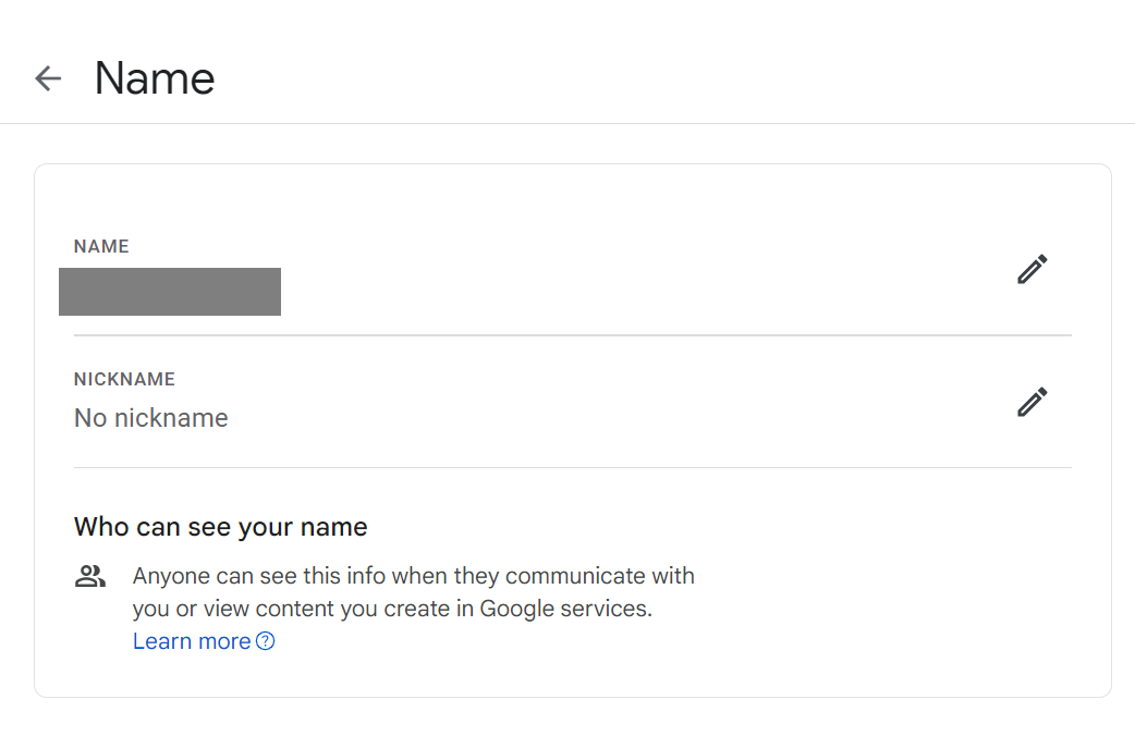 - 检查姓名部分:您在 Google Meet 中的显示名称将列在“姓名”部分下。