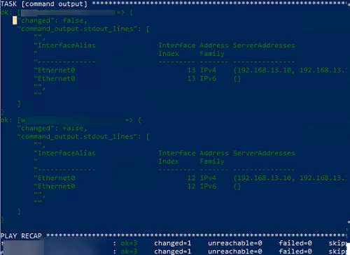 在此示例中,该 playbook 已在所有 Windows 主机上成功执行,并返回了当前的 DNS 设置。