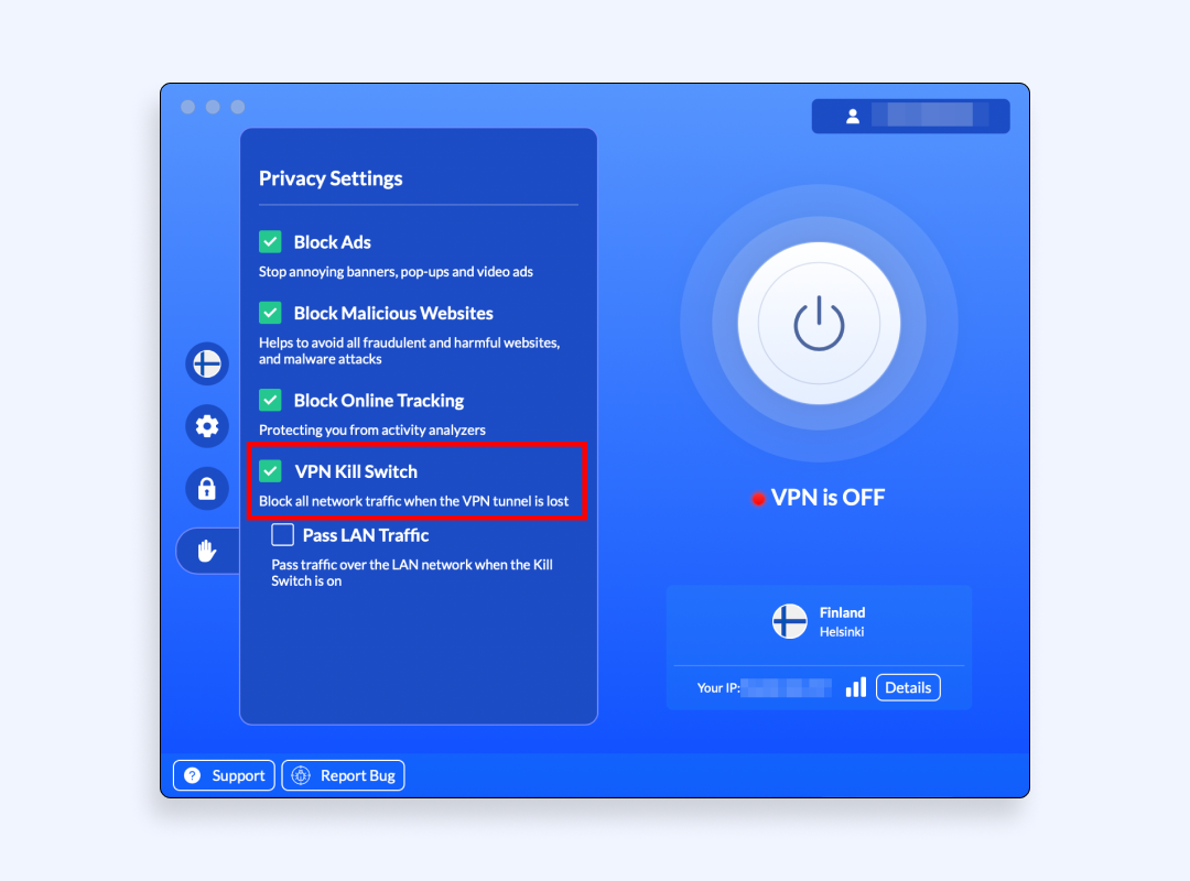 4. 打开 VeePN 的“隐私设置”部分中的“Kill Switch”功能,以确保在您的 VPN 连接出现故障或突然断开时,您的真实 IP 地址永远不会泄露。