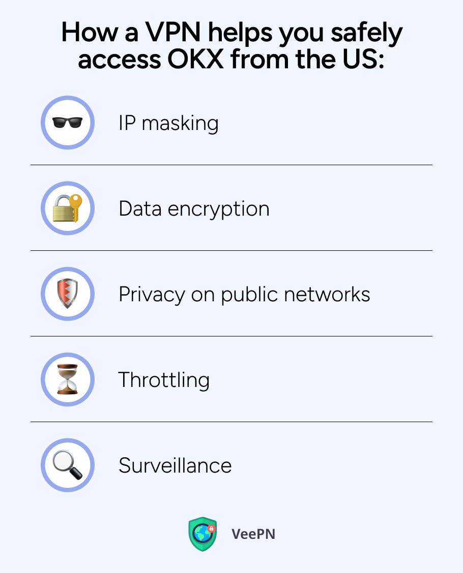 使用 OKX 是安全的,因为它提供冷钱包存储、2FA 和储备证明。然而,它在 2025 年受到了 5.04 亿美元的罚款,因此无法在美国合法使用。您还可以使用维PN当您使用公共或未受保护的网络时,保护您的私人详细信息不被黑客窃取。