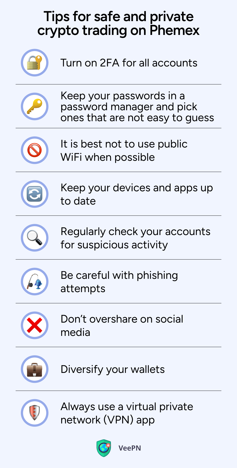 🤩避免帐户锁定和服务封锁。如果 Phemex 检测到来自受限区域的访问,则可以暂停或阻止帐户。始终使用 VPN 有助于防止这种检测,因此您可以不间断地访问您的帐户和资金。