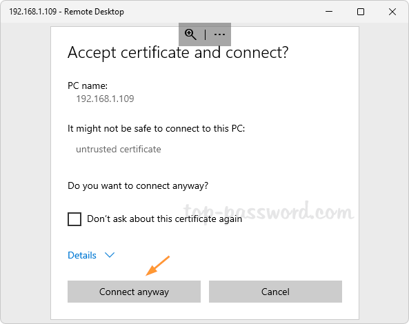 - 勾选“不再询问此证书”复选框,然后单击“无论如何连接”。