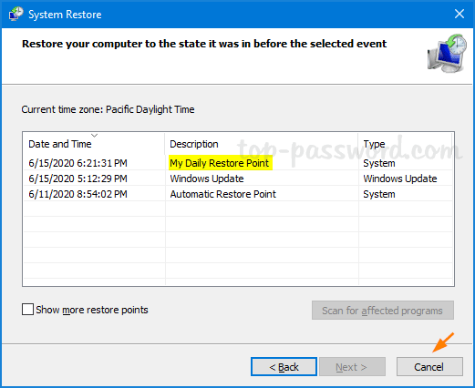 - 检查完您的还原点后,单击取消关闭系统还原。