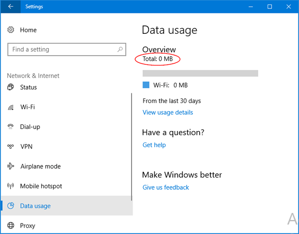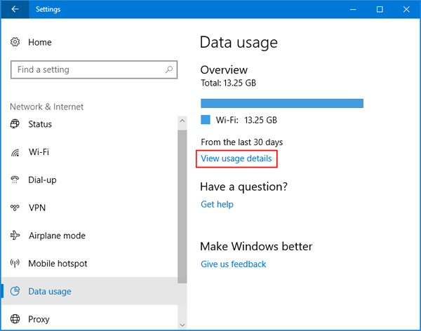 - 选择数据使用情况面板左侧的选项。从那里,您可以查看过去 30 天内在 Windows 10 电脑上使用的网络数据。