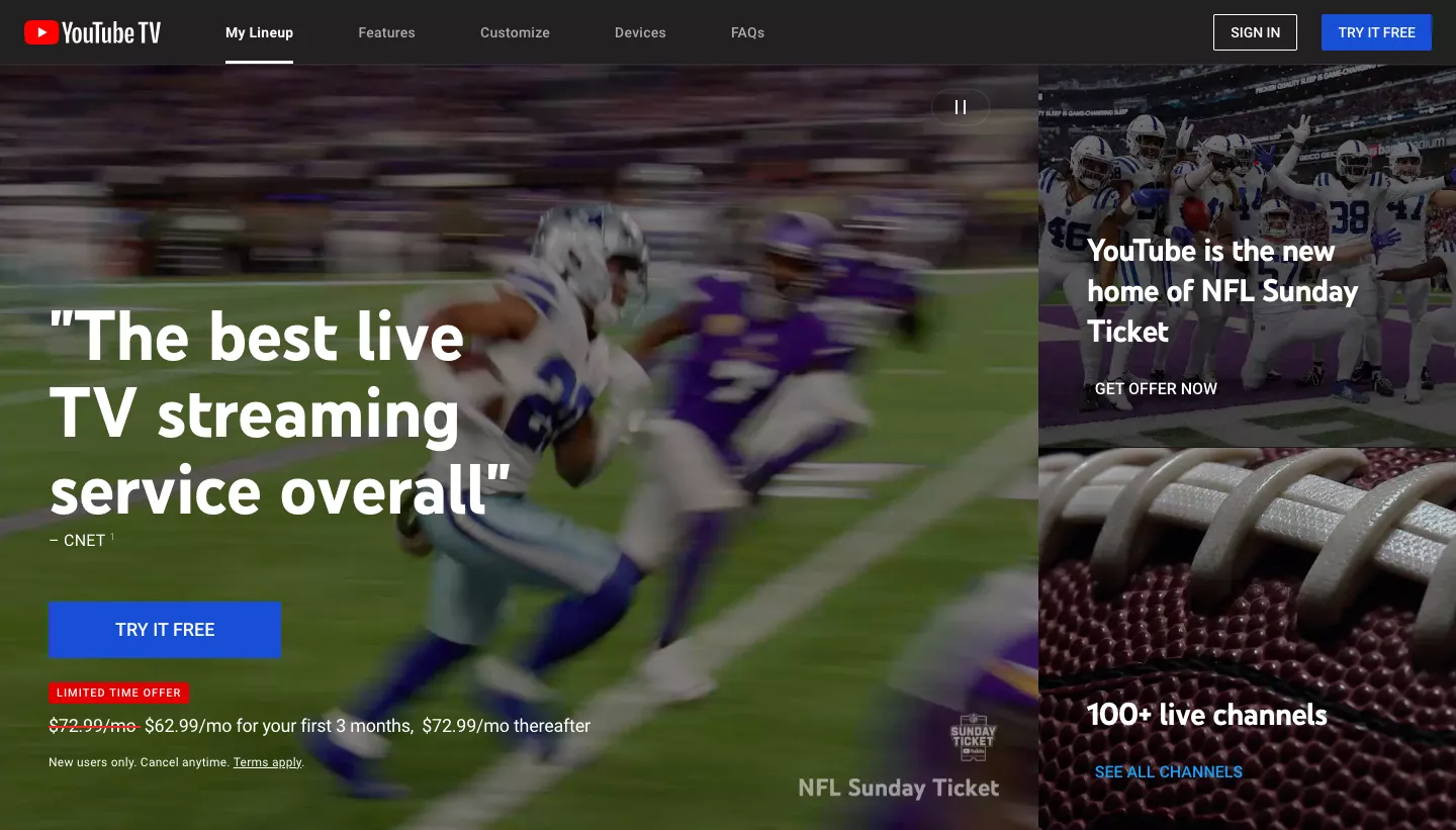 YouTube TV 提供大量美国电视频道,包括 ABC、NBC、NFL Network、ESPN、NBC Sports 和 NBA TV。自 2023 年以来,这个流媒体平台让球迷可以通过 NFL Sunday Ticket 欣赏每场 NFL 比赛,包括本地、全国和场外比赛。然而,NFL RedZone 作为附加项目提供,需要额外付费。另请注意,YouTube TV 是我们列表中最昂贵的选项之一(但免费试用期也最长)。