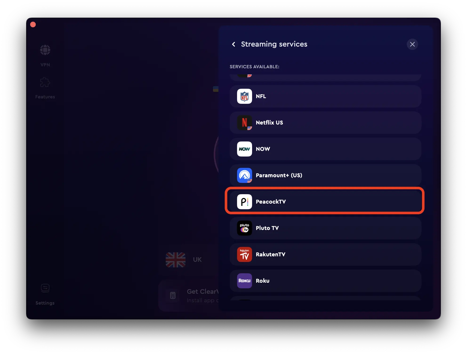 - 选择您想要取消阻止的流媒体服务。在这种情况下,它将是“PeacockTV”。