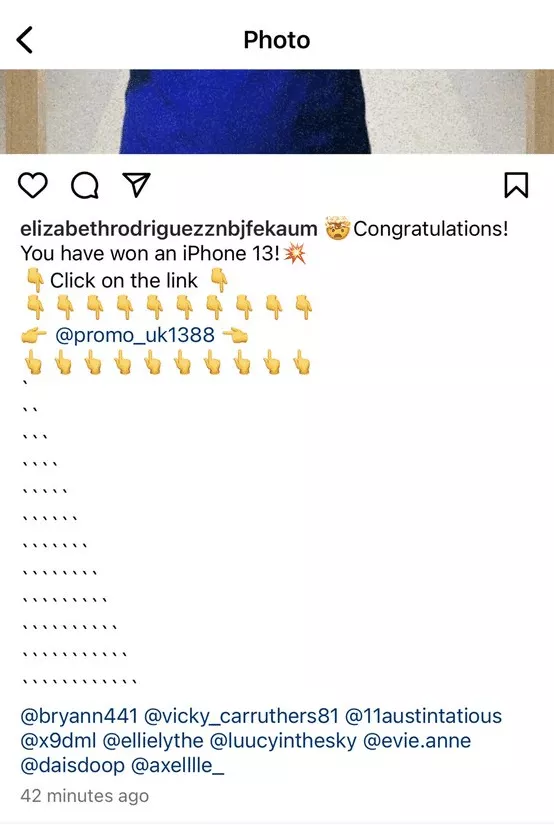 - 向您提供诱人的报价并提供将您引导至诈骗者控制的网站的链接。他们要求您填写个人信息,一旦您输入,骗子就可以控制您的帐户。您是否注意到有陌生人在有关赢得(例如,免费 iPhone 13)的帖子中标记您?是的,在这种情况下,您唯一赢得的就是恢复您的个人资料所带来的压力。
