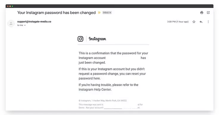 虽然这封电子邮件看起来像真的,但我们可以看到它发送的地址与 Instagram/Facebook 的官方地址相去甚远——@mail.instagram.com 或 @facebookmail.com。因此,虽然您收件箱中的那封声称来自 Instagram 的电子邮件乍一看似乎是合法的,但点击其中的任何链接可能会让您和您的帐户面临风险。
