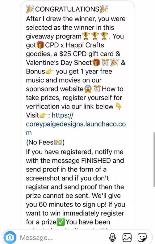 - 通过虚假品牌帐户推出赠品。不法分子可以建立一个真实品牌的虚假帐户来推出他们自己的赠品(或假赠品,就此而言)。然后他们祝贺那些对获奖发表评论的人。诈骗者通过回复获奖者的评论或向他们发送私信来联系获奖者。此消息通常具有带有注册表单的传出链接。为了获得奖品,参与者当然必须填写他们的个人和银行详细信息,然后这些信息将被骗子摆布。