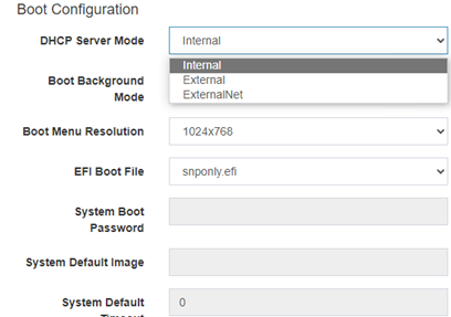 默认情况下,iVentoy 使用自己的内置 DHCP 服务器。如果您的网络上有 DHCP 服务器,请转至引导配置部分并选择外部的(如果 DHCP 位于同一 VLAN 中)或外部网络(如果 DHCP 服务器位于当前 VLAN 之外,并且数据包通过 dhcp-relay 转发给它)。