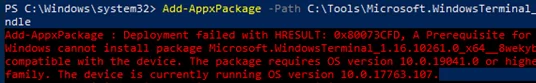 Add-AppxPackage : Deployment failed with HRESULT: 0x80073CFD, A Prerequisite for an install could not be satisfied. Windows cannot install package Microsoft.WindowsTerminal_1.18.3181.0_8wekyb3d8bbwe because this package is not compatible with the device. The package requires OS version 10.0.19041.0 or higher on the Windows.Mobile device family. The device is currently running OS version 10.0.17763.107.