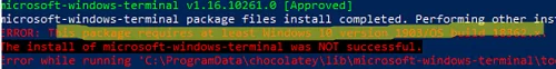ERROR: This package requires at least Windows 10 version 1903/OS build 18362.x. The install of microsoft-windows-terminal was NOT successful. Error while running 'C:ProgramDatachocolateylibmicrosoft-windows-terminaltoolschocolateyInstall.ps1'.