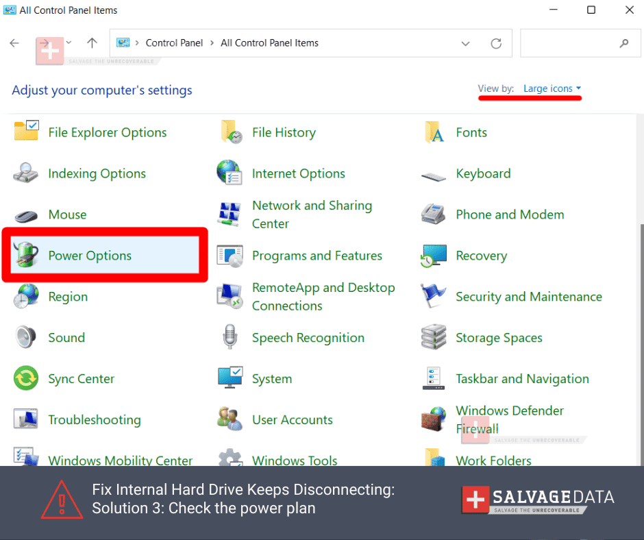 故障的电源可以防止您的内部HDD正常工作,从而导致内部硬盘驱动器断开连接。通过检查电源计划,您可以从问题原因列表中冒险或正确修复它。要检查Windows计算机上的计算机电源计划,请转到控制面板。然后将视图更改为大图标,以便您可以找到电源选项菜单。