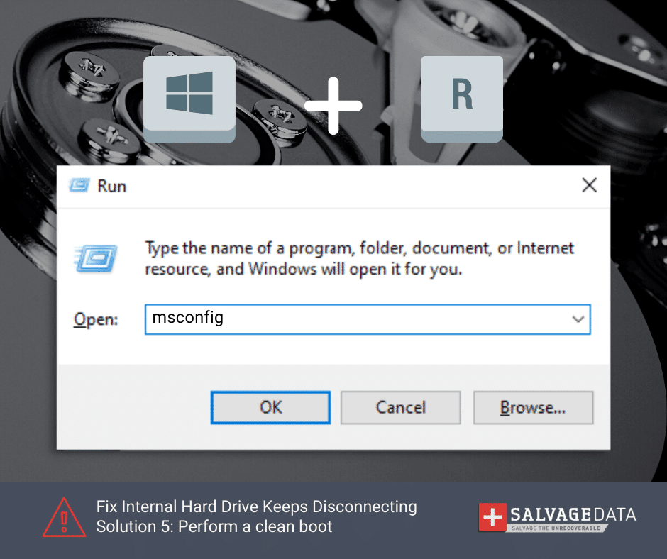 要在Windows计算机上执行干净的启动并修复了内部硬盘的断开连接问题,您必须按Windows + R键。然后输入MSCONFIG并点击Enter。