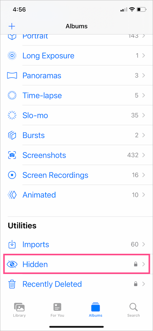 - 导航至“照片”应用,点击专辑,然后向下滚动到屏幕底部。现在,隐藏和最近删除的相册前面将出现一个锁定图标。