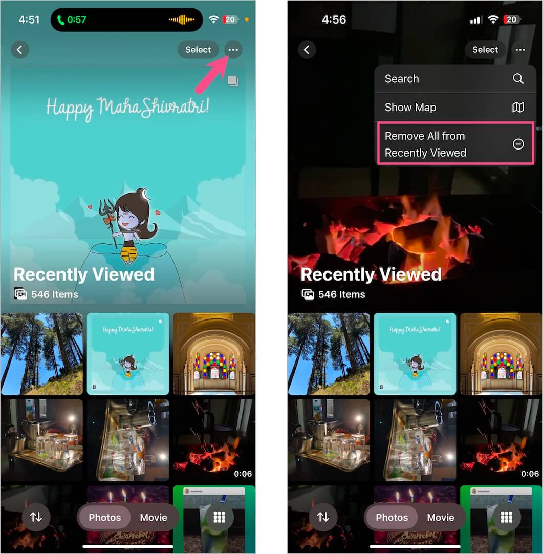 - 要一次删除所有最近查看的照片,请点按省略号按钮(3 个点)位于右上角并选择“从最近查看的内容中删除所有内容”。