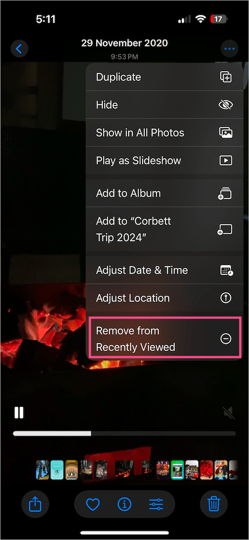 为此,请转到“最近查看”文件夹,然后打开要从“最近查看”中删除的照片或视频。然后点击右上角的三点菜单并选择“从最近查看的内容中删除”。确认继续。