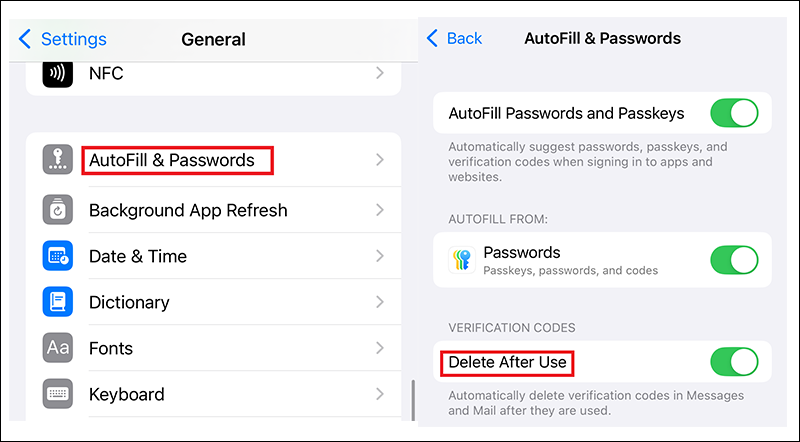 步骤:转到 iPhone 设置,然后点击常规,向下滚动并找到自动填充和密码。在验证码部分,打开使用后删除选项。