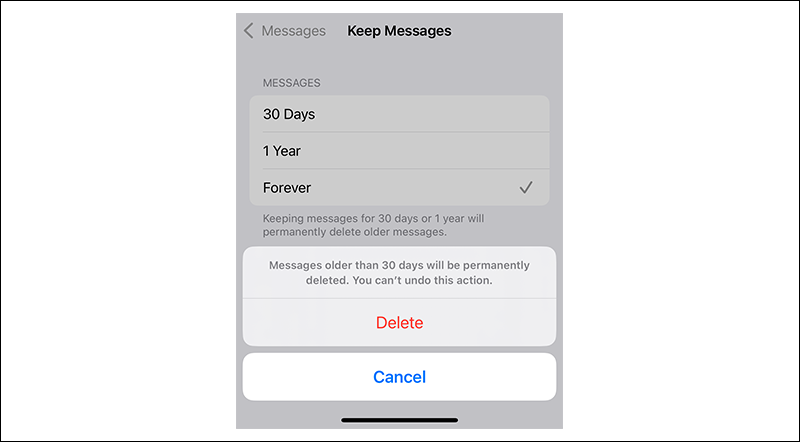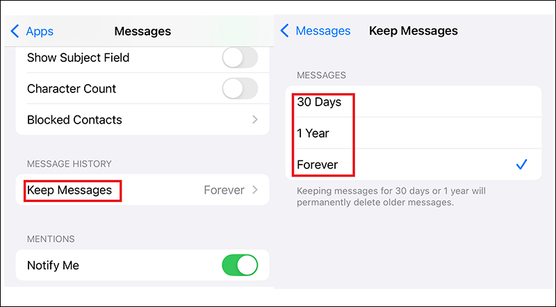 步骤2:在消息历史记录部分下,点击“保留消息”。根据您的喜好选择“30 天”、“1 年”或“永远”。