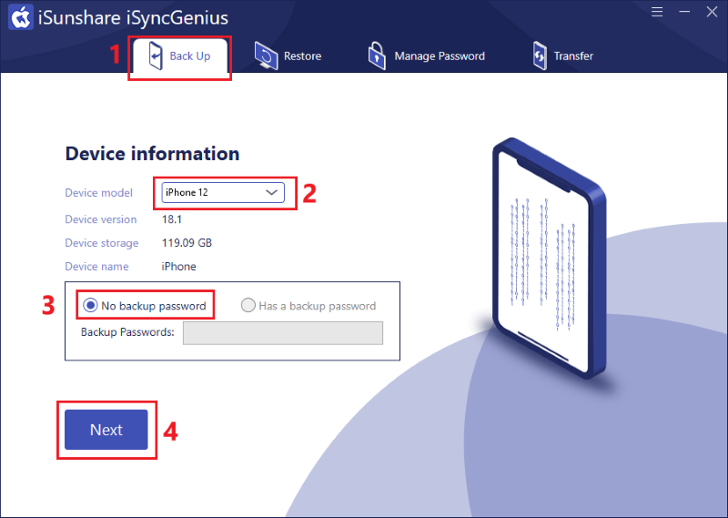 步骤2:在备份部分中,选择您的设备型号。输入备份密码(如果可用),然后单击下一个。