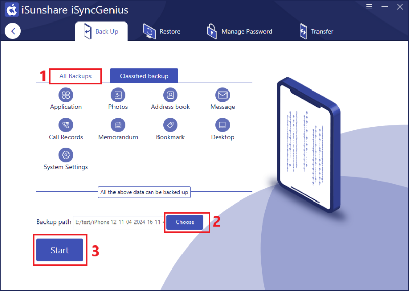 步骤3:选择所有备份,然后选择PC上的备份路径。设置好后,点击开始按钮。