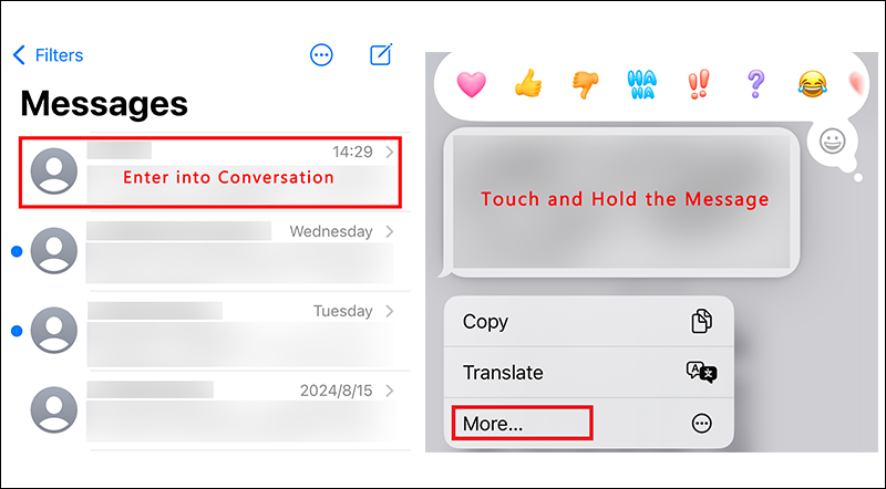 步骤2:滚动浏览聊天,找到您要删除的特定消息。按住该消息直至出现菜单。从菜单中选择“更多的”。