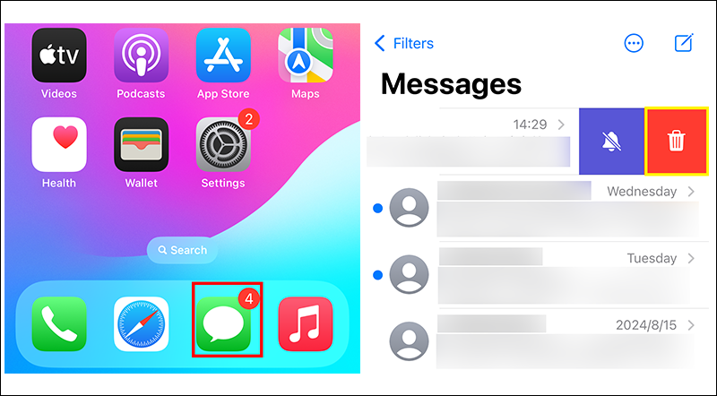 步骤2:在要删除的对话上向左滑动。点击红色“删除”按钮从 iPhone 中删除对话。
