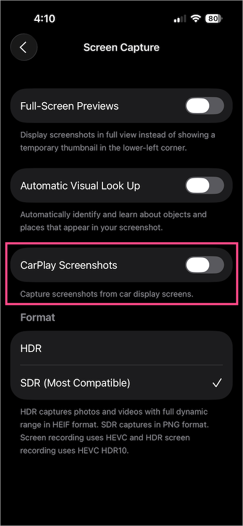 就是这样!一旦禁用,您的 iPhone 将不再将汽车屏幕的屏幕截图保存到您的照片库中。