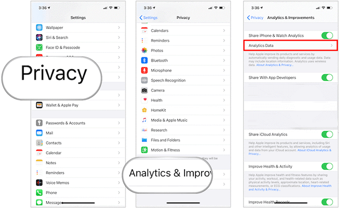 如果存储不是问题,请检查有问题的应用程序。转到“设置”>“隐私”>“分析和改进”>“分析数据”,然后查找重复列出的应用程序。删除这些应用程序可能会解决该问题。