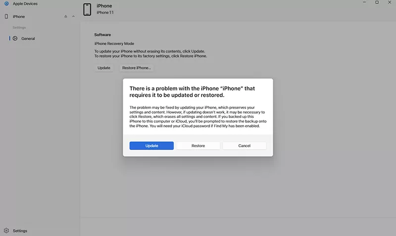 2. 打开 Apple 设备,它会检测您的 iPhone 并提供更新或恢复选项。