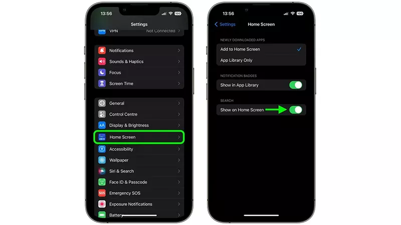 第 2 步:向下滚动“设置”并点击“主屏幕”。然后,关闭“搜索”部分下的“在主屏幕上显示”选项。如果它已经关闭,请尝试将其打开然后再次关闭。