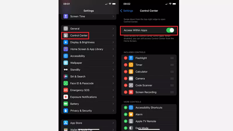 轻敲设置>控制中心,然后打开应用程序内访问。