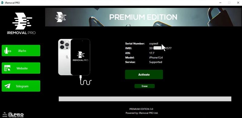 对于 iRemoval Pro(高级版):如果它与您的 iDevice 兼容,请单击工具界面右侧的 Telegram 按钮。它将带您进入他们的官方 Telegram 频道。接下来,向他们发送消息:提及您的 SN 号、设备型号,并请求服务。
