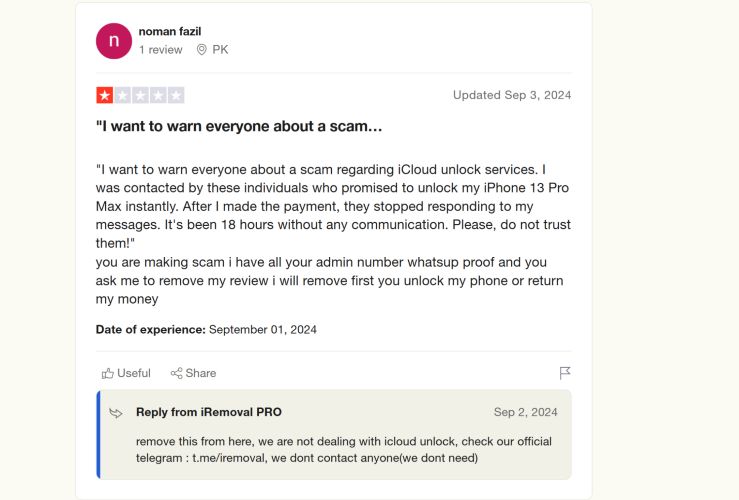 然而,当谈到与 iCloud 激活锁相关的评论时,情况发生了变化。例如,诺曼·法齐尔分享了有关诈骗的警告。他表示有人联系他,为他的 iPhone 13 Pro Max 提供 iCloud 解锁服务。付款后,通讯就停止了。不过,最能说明问题的是 iRemoval PRO 官方回应:“我们不处理 iCloud 解锁问题。请查看我们的官方 Telegram。”
