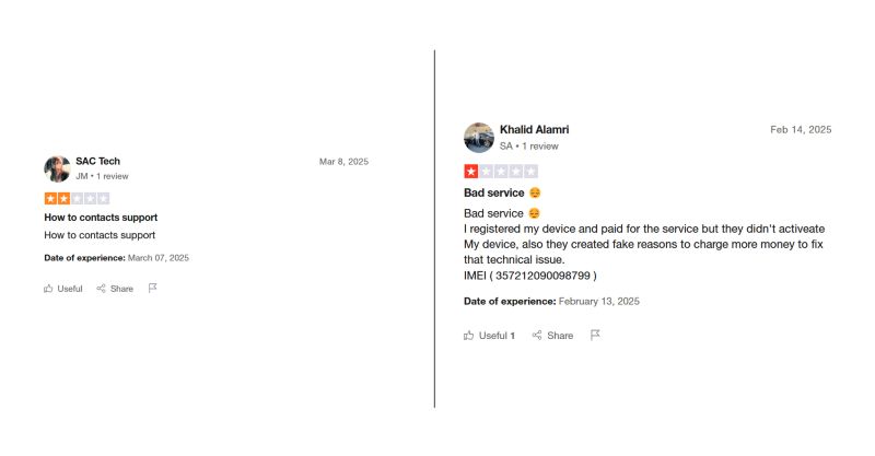 哈立德·阿拉姆里即使在全额付款后,他的设备仍未激活,但仍留下一星评价。他声称该团队将其归咎于捏造的技术问题,并要求更多资金来继续。