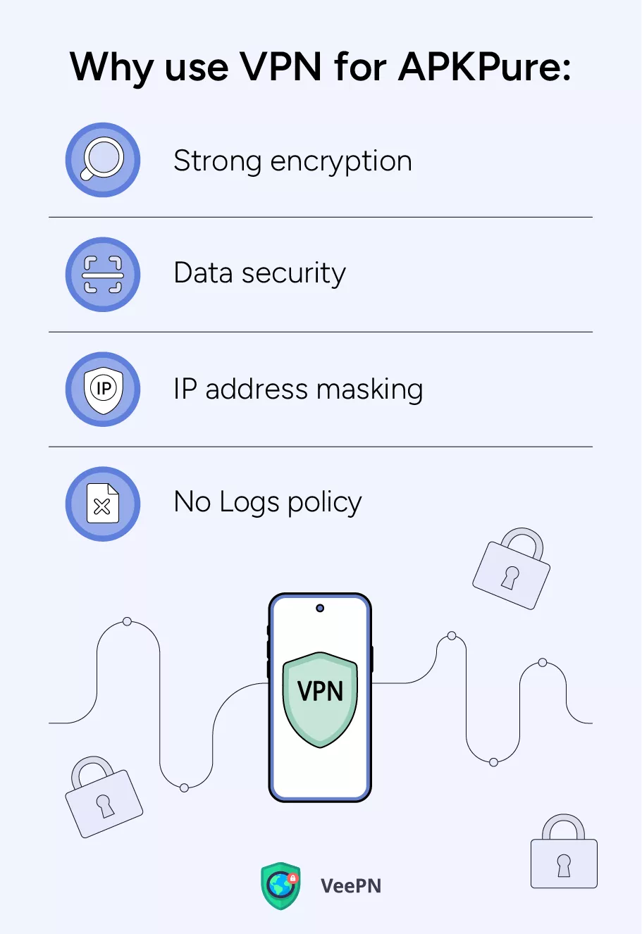 简而言之,APKPure 并不完全安全因为您无法确定您安装的应用程序是否不包含恶意软件/间谍软件。为了在从 APKPure 下载应用程序时保护自己,请使用 VeePN — 一款强大的 VPN 应用程序,它将加密您的所有互联网流量并阻止任何恶意软件。