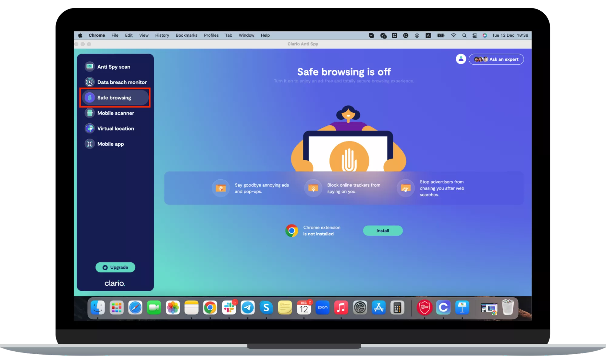 在 Mac 设备上,安全浏览可作为 Chrome 和 Safari 扩展程序使用。在 Windows 设备上,它作为内置工具运行。无论您拥有什么设备,Clario AntiSpy 的安全浏览工具易于使用。使用方法如下: