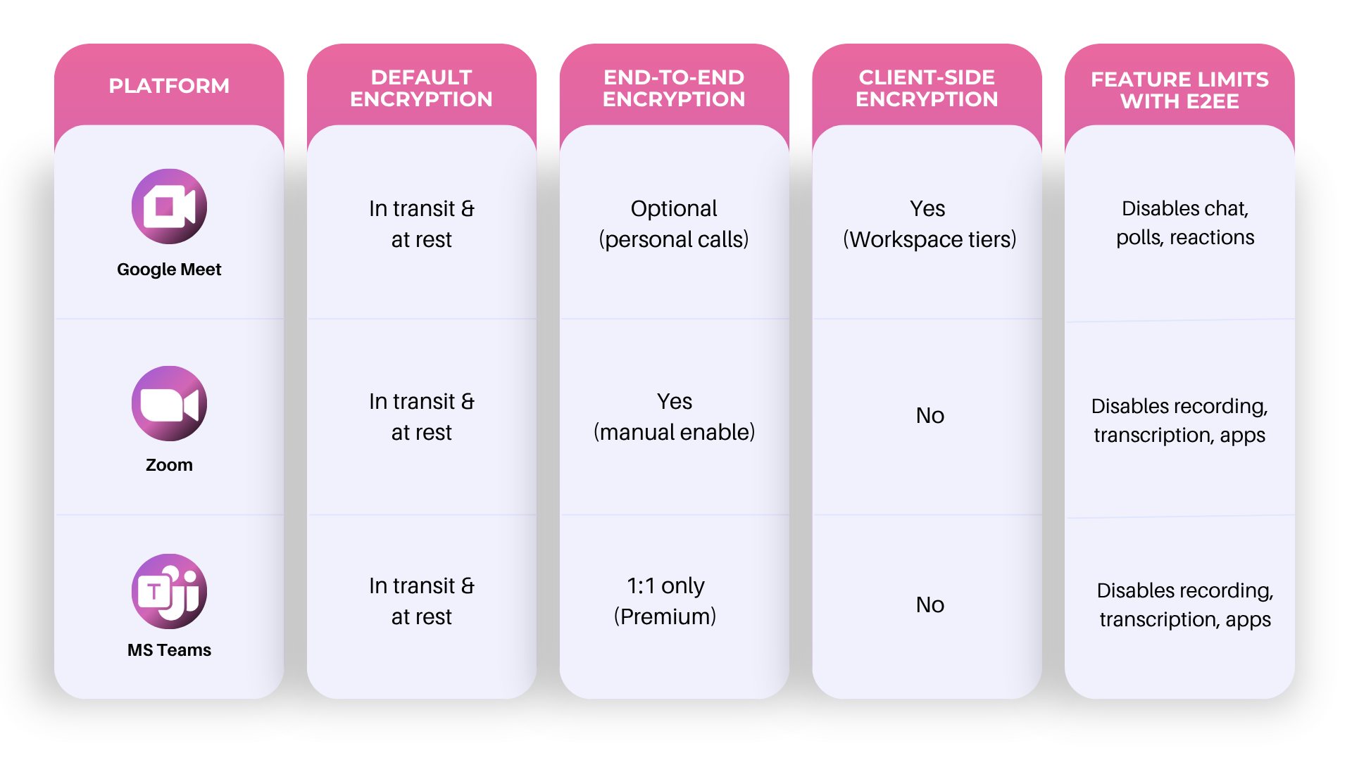 以下是 Google Meet 在加密和隐私方面与 Zoom 和 Microsoft Teams 的比较: