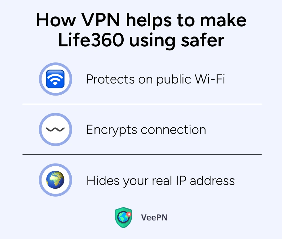 当您在公共Wi-Fi或任何未受保护的网络上使用Life360时,Life360的VPN可以保护您免受可能拦截数据的黑客的侵害。