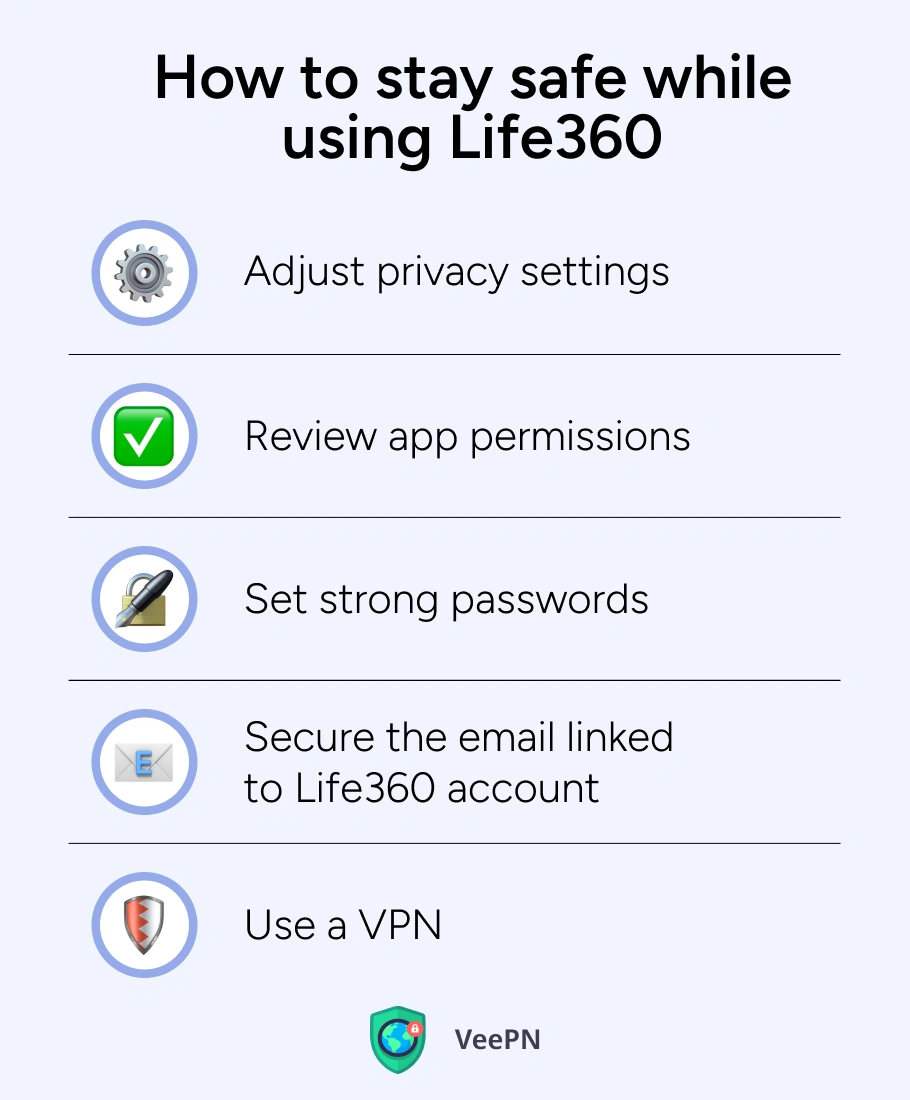 在手机上,打开“设置”→“应用程序”→“ Life360”,然后检查其具有的权限(例如位置,麦克风,相机,否则)。关闭任何不必要的东西,以降低LIFE360安全泄漏的风险。
