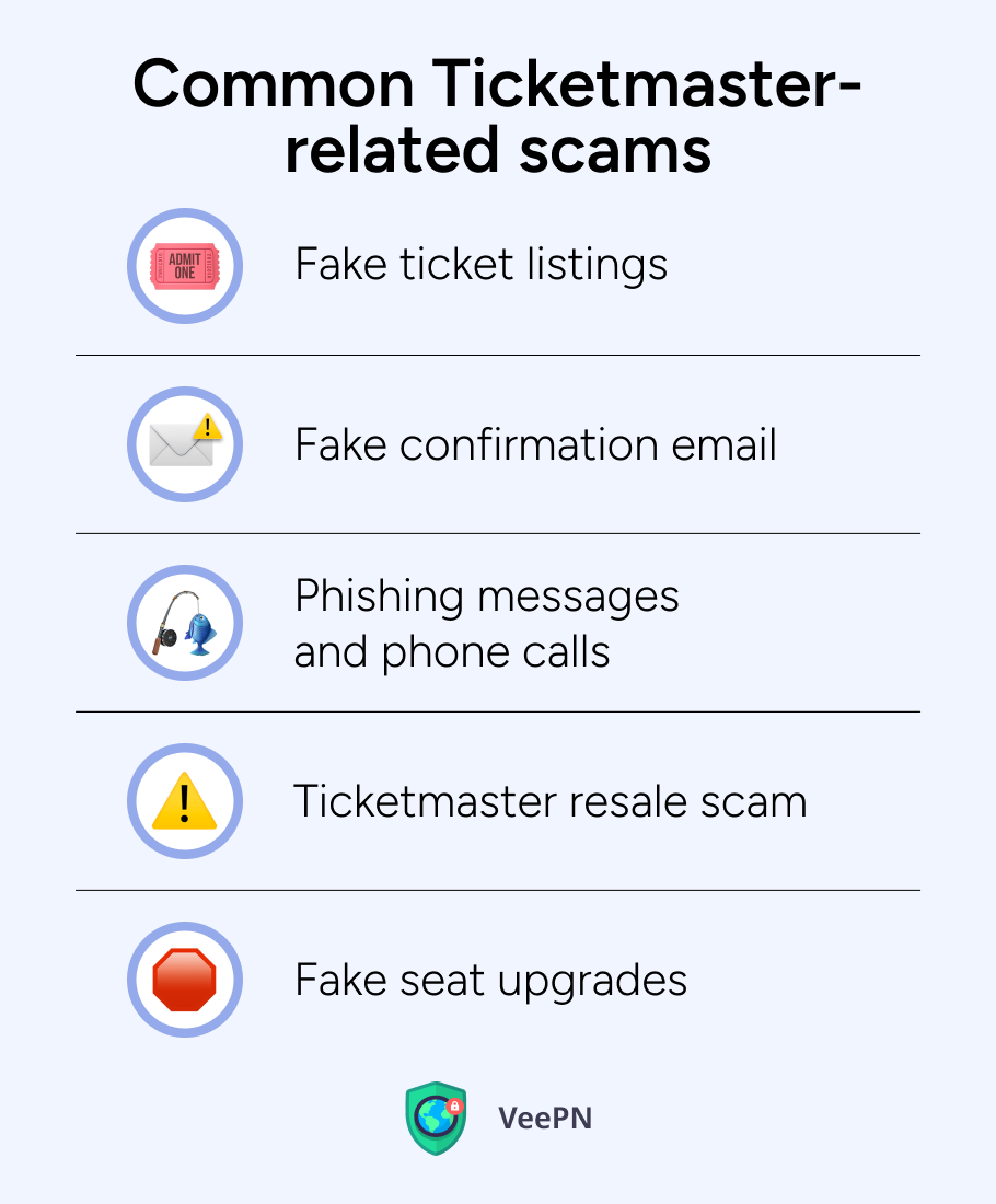 有时,骗子会冒充 Ticketmaster 代表并利用其大名。通常,他们通过网络钓鱼电子邮件、电话或可疑的弹出窗口来进行此操作。恶意行为者还可能创建假的 Ticketmaster 门票或破解用户帐户。与此同时,Ticketmaster官方地点仍然是合法渠道,尽管并不完全安全。