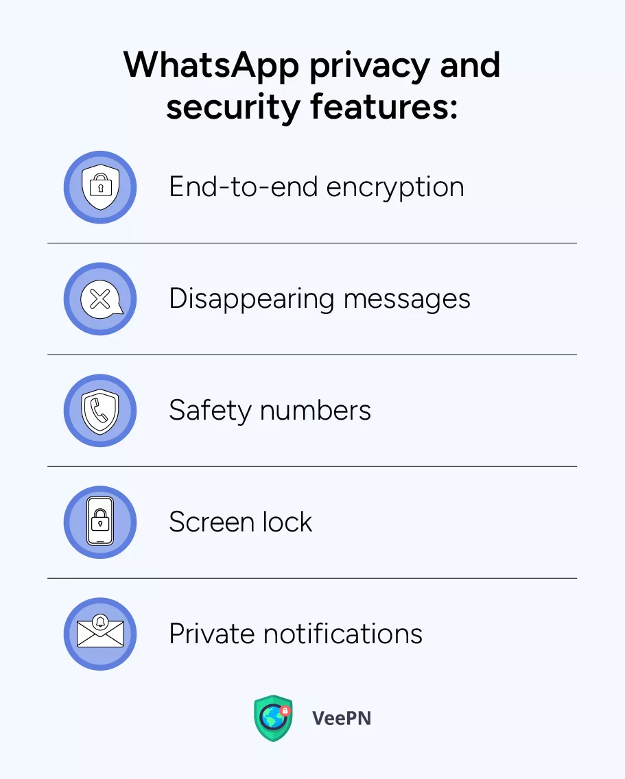 由于该应用程序的端到端加密确保只有您和收件人才能阅读消息,因此某人不太可能监视您的 WhatsApp 消息。但是,存在潜在的漏洞,例如您的设备上存在恶意软件或未经授权访问您的帐户。保持您的设备和 WhatsApp 应用程序更新且安全至关重要,并使用 VeePN 等可靠的 VPN 服务来最大程度地降低您的隐私风险。