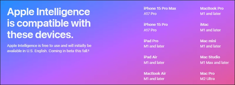 Apple Intelligence 兼容的设备包括iPhone 15 专业版或运行 A17 pro 芯片的更新型号,以及配备 M1 芯片的 iPad 和 Mac或更高版本。具体包括: